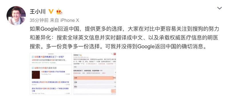 针对最近的“Google 重返我国市场”风闻,搜狗 CEO 王小川